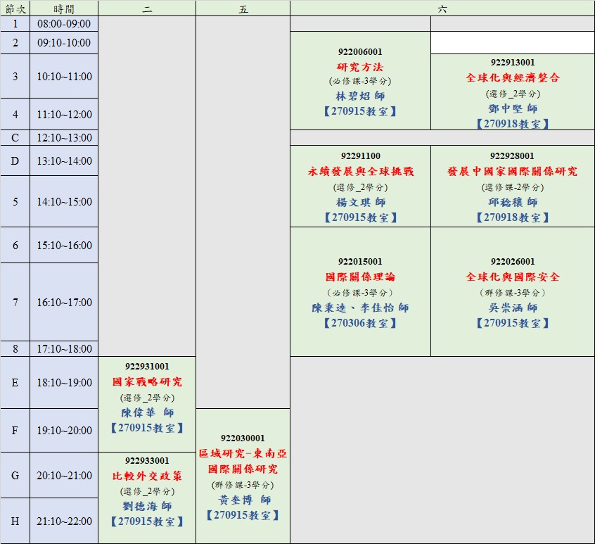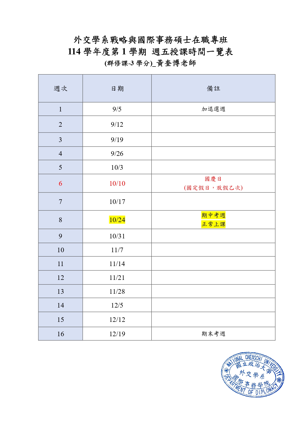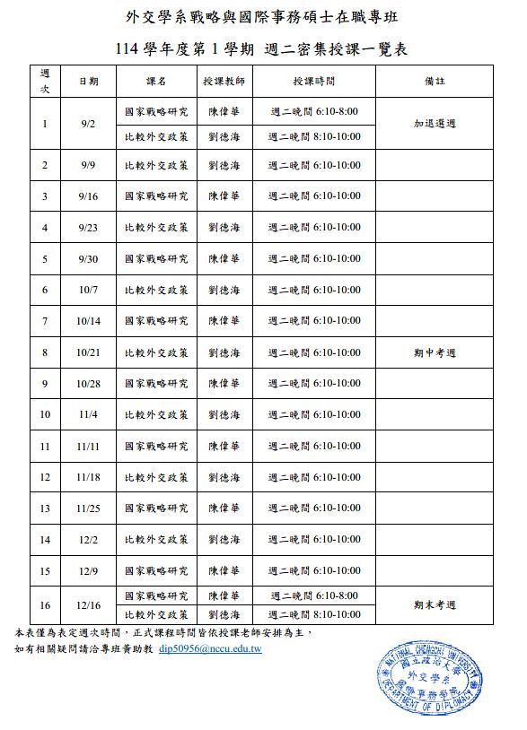 關於114學年度第1學期外交學系戰略與國際事務碩士在職專班授課日期一覽表,請參照圖示。