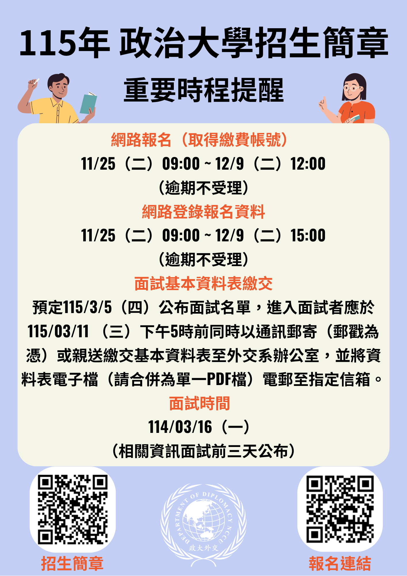 1. 符合面試資格者,應於115年3 月 11 日(三)下午 5 時前繳交基本資料表(請至本系網頁下載後填寫,最後一頁需親筆簽名),並以通訊郵寄方式寄達或親送本校外交系辦公室,並請同時將上述基本資料表及相關備審文件電郵至dip50918@nccu.edu.tw及dip50918.nccu@gmail.com ,所有應檢附之文件,請合併為一個PDF檔。俾便辦理口試事宜。